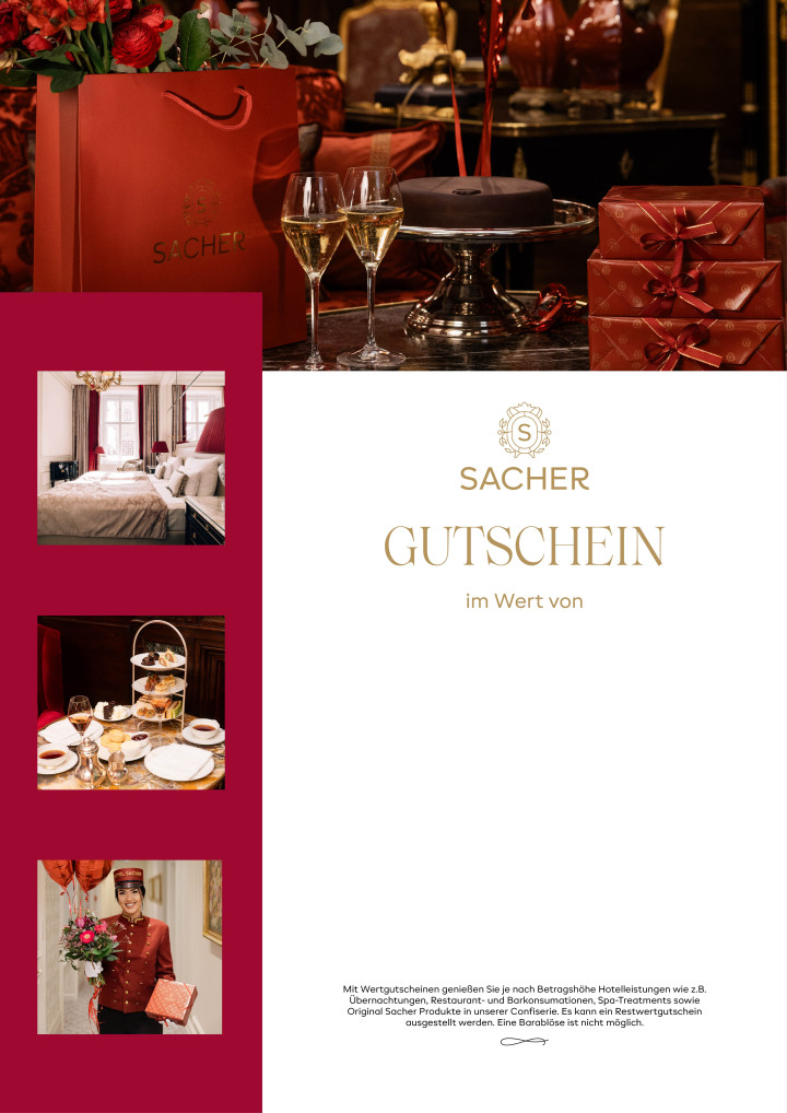 Verschenken Sie unvergessliche Momente mit einem stilvollen Sacher-Gutschein in frei wählbarem Wert! Ob kulinarische Genüsse in unseren 5*-Superior-Hotels in Salzburg, Seefeld oder Wien, Cafés, Restaurants und Confiserien oder entspannte Stunden im exklusiven Sacher Spa – Ihr Geschenkgutschein ermöglicht einzigartige Erlebnisse, die in Erinnerung bleiben. Wählen Sie aus eleganten Sacher-Vorlagen oder verleihen Sie dem Gutschein zum Ausdrucken mit persönlichen Fotos und einer individuellen Nachricht eine ganz besondere Note! Das perfekte Geschenk mit diesem Geschenkgutschein.